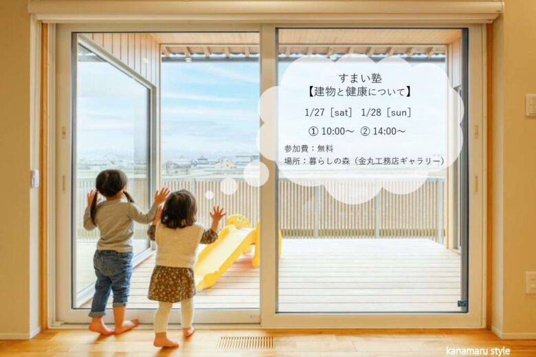 すまい塾 ‐建物と健康について‐ ■日時:2024年1月27日(土)~28日(日) 各日2回開催 ➀10:00~ ②14:00~ ■会場:暮らしの森〈金丸工務店ギャラリー〉 ■申込〆切:2024年1月26…