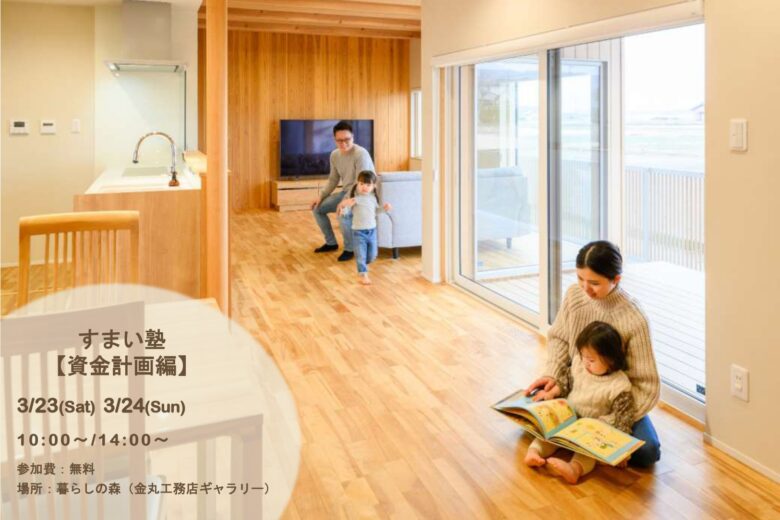 すまい塾 ‐資金計画編‐ ■日時:2024年3月23日(土)~24日(日) 各日2回開催 ➀ 10:00~ ② 14:00~ ■会場:暮らしの森【金丸工務店ギャラリー】 ■申込〆切:2024年3月22日…