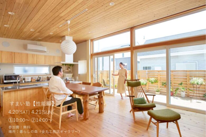 すまい塾 ‐性能編‐ ■日時:2024年4月20日(土)~21日(日) 各日2回開催 ➀ 10:00~ ② 14:00~ ■会場:暮らしの森【金丸工務店ギャラリー】 ■申込〆切:2024年4月19日(金…