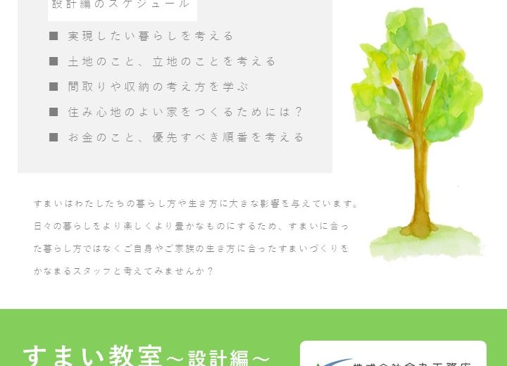 すまい教室とは、すまいづくりに関する「疑問」や「不安」を解決へと導くことで 安心してすまいづくりがスタート出来るようにかなまるスタッフがお手伝いするイベントです。 ~設計編~「何部屋ほしい。」よりも大切なことを学ぶ。 住…