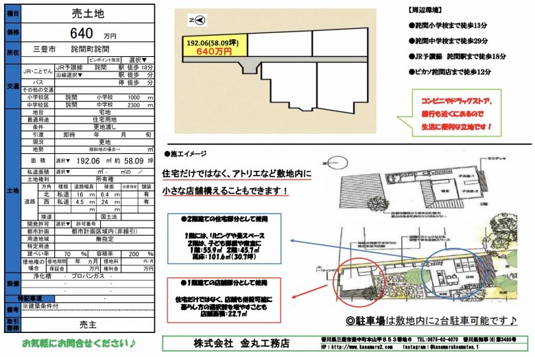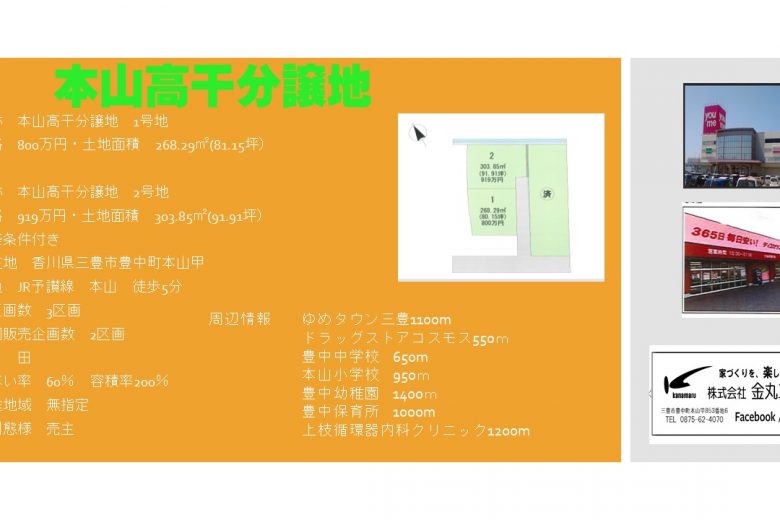 屋敷内分譲地 三豊市豊中町の分譲地が残り2区画となりました! 名称:屋敷内分譲地 所在地:香川県三豊市豊中町本山甲 交通:JR本山駅より徒歩約12分 地目:田(建築後宅地) 用途…